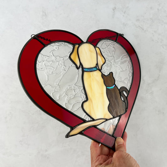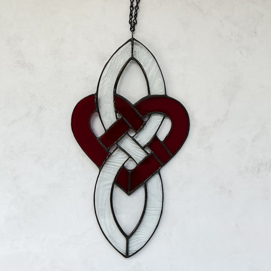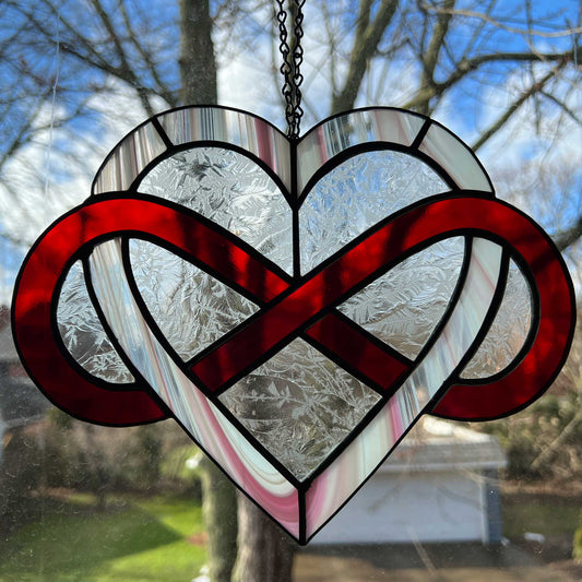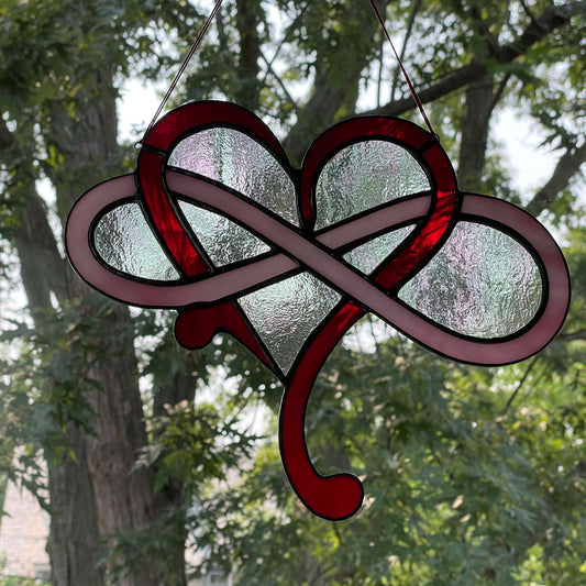 Infinity Heart Suncatcher - Red and Pink with Clear Leaf glass 9.5 x 7.5)