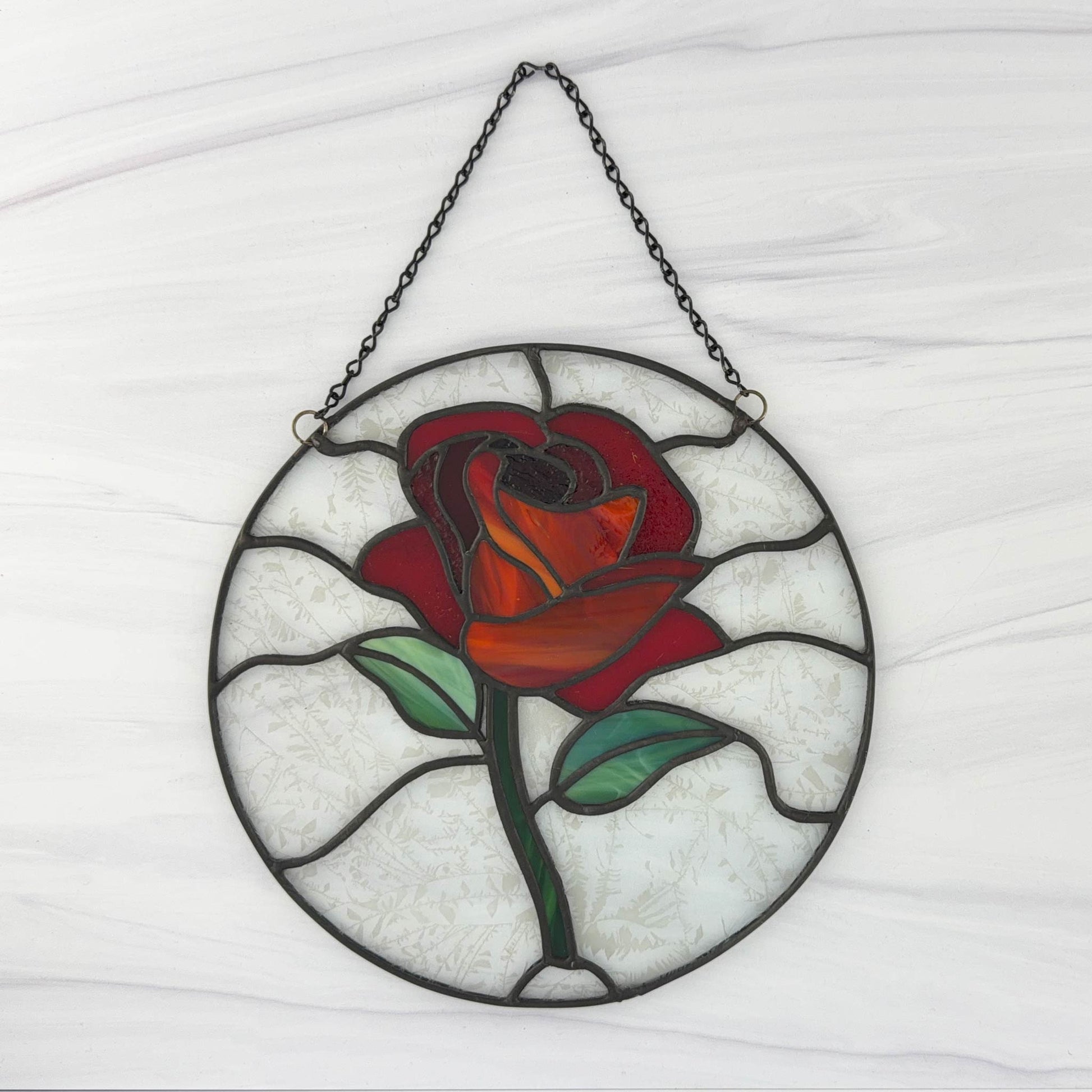 This variegated red rose stained glass suncatcher is a stunning piece of art, perfect for brightening up any room or window. Measuring 8.5 inches in diameter, this circular suncatcher features a vibrant red rose at its center and two light green leaves.