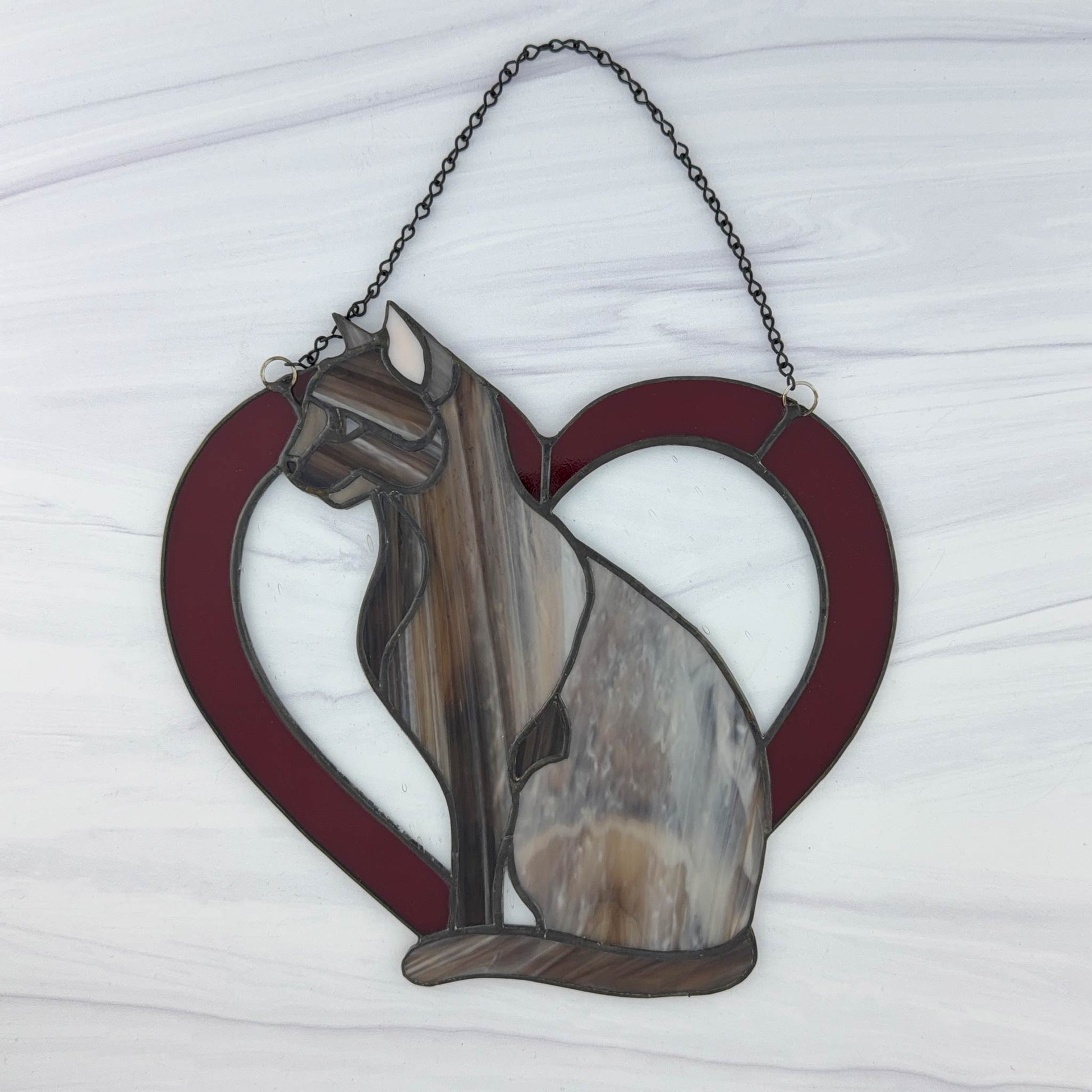 - This sitting cat is made with a brown, white and subtle red swirled glass with a deep red heart and a raindrop clear glass to complete the piece. You can reverse the cat so it is looking in the opposite direction.