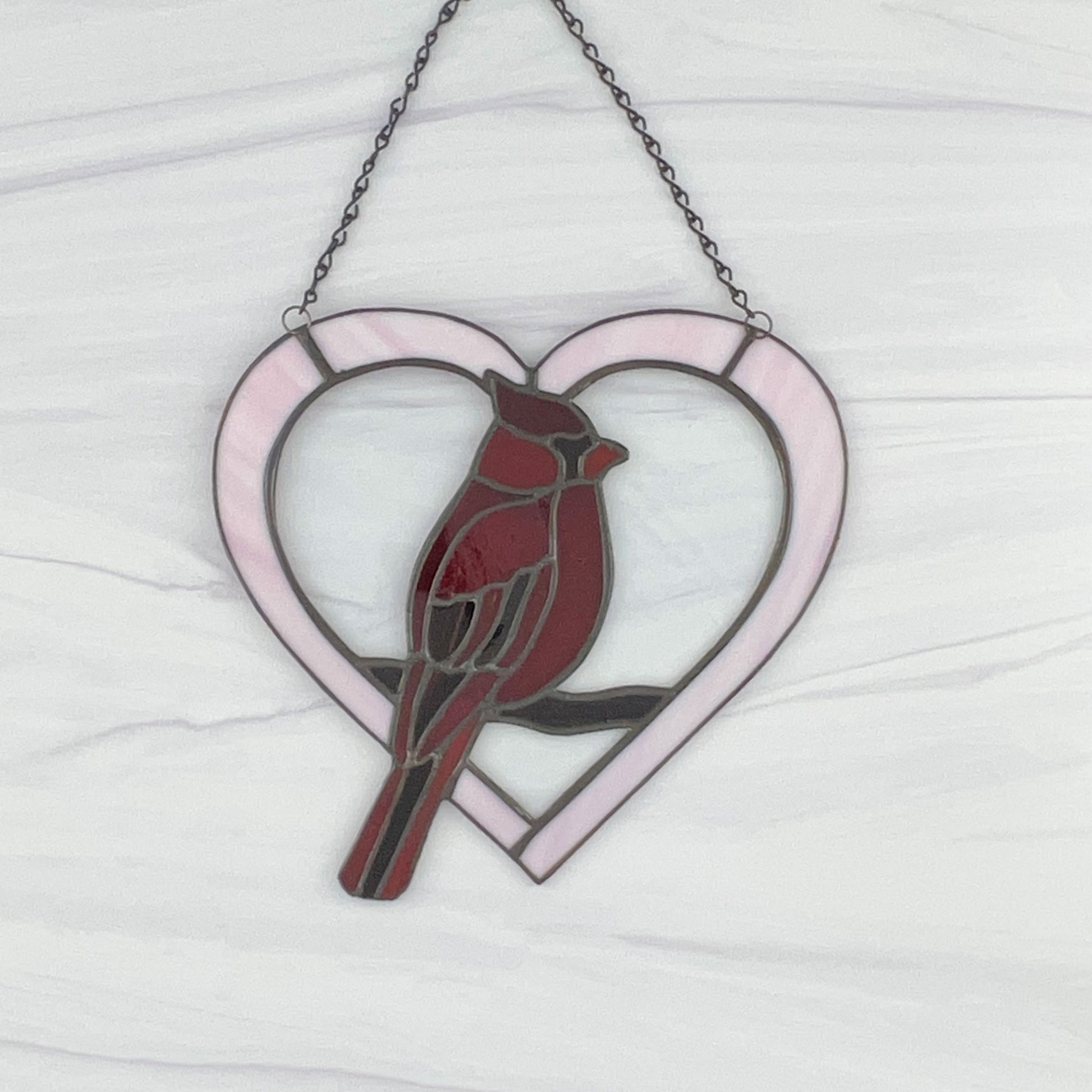 - This Cardinal Heart is designed with multiple shades of red and the cardinal is perched on a brown tree branch surrounded by a clear swirl glass framed in a pink heart.